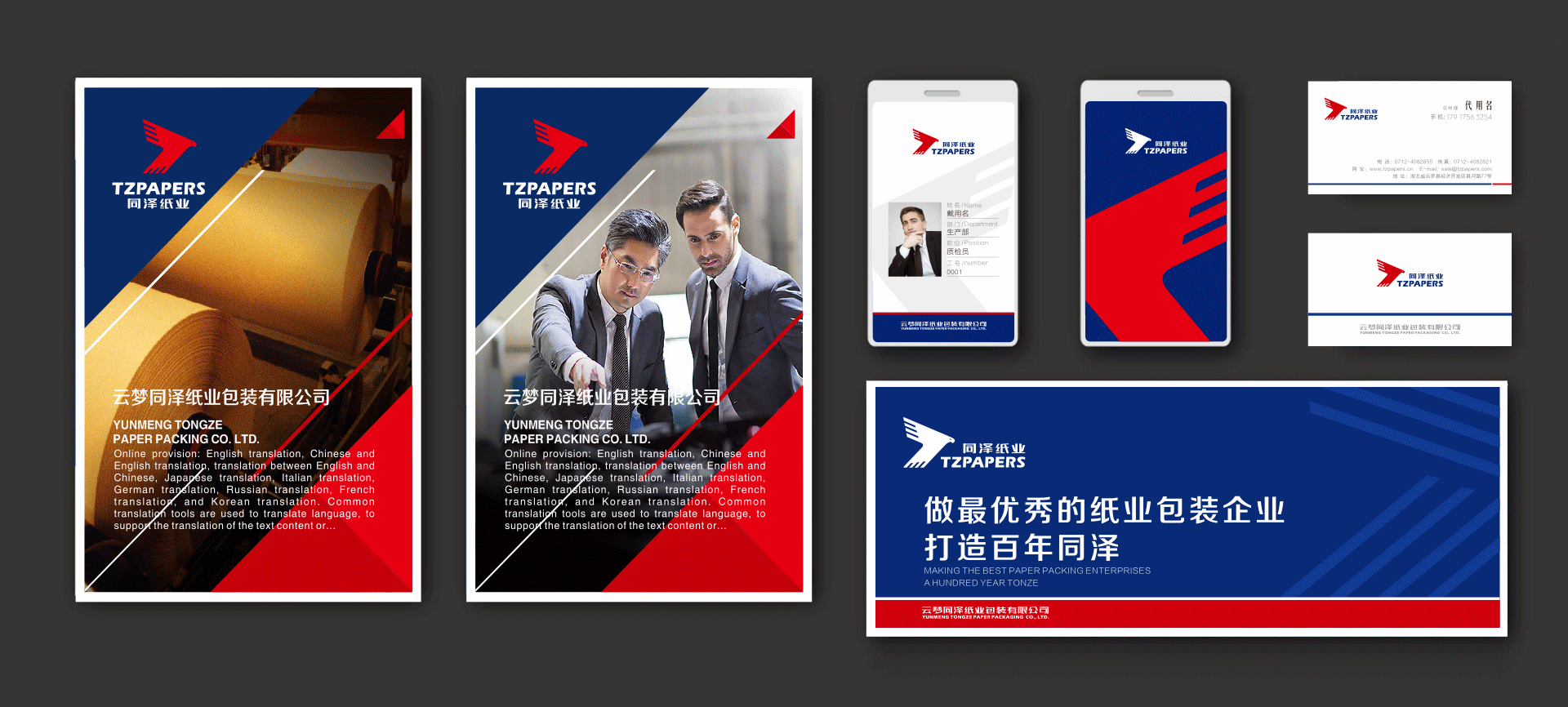 我們在對同澤紙業的情況做出詳細調研之后,以品牌logo為切入點,奠定企業品牌個性,首字母“T”創意變為鷹在翱翔天空的形態,寓意企業發展穩健、高瞻遠矚、生機勃發。通過品牌個性延伸拓展,統一辦公應用和廠區應用,以企業宣傳畫冊為載體展現品牌實力和企業文化。